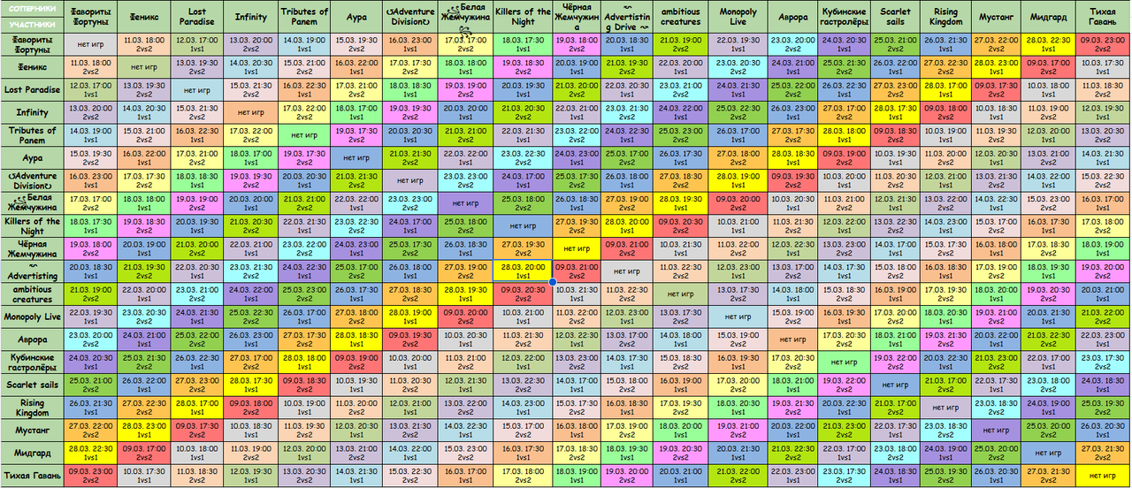 VIII Игра "Весеннего кланового Турнира'2026" 16 МАРТА (1 vs 1) № клан №1 клан №2 время МСК Победители 1 ꧁Белая Жемчужина꧂ Тихая Гавань 17:00 2 Killers of the Night Мидгард 17:30 3 Чёрная Жемчужина Мустанг 18:00 4 ↜ Advertisting Drive ↝ Rising Kingdom 18:30 5 ambitious creatures Scarlet sails 19:00 6 Monopoly Live Кубинские гастролёры 19:30 7 Феникс Аура 22:00 8 Lost Paradise Tributes of Panem 22:30 9 Фавориты Фортуны ↺Adventure Division↻ 23:00 IX Игра "Весеннего кланового Турнира'2026" 17 МАРТА (2 vs 2) № клан №1 клан №2 время МСК Победители 1 Фавориты Фортуны ꧁Белая Жемчужина꧂ 17:00 2 Феникс ↺Adventure Division↻ 17:30 3 Killers of the Night Тихая Гавань 18:00 4 Чёрная Жемчужина Мидгард 18:30 5 ↜ Advertisting Drive ↝ Мустанг 19:00 6 ambitious creatures Rising Kingdom 19:30 7 Monopoly Live Scarlet sails 20:00 8 Аврора Кубинские гастролёры 20:30 9 Lost Paradise Аура 21:00 10 Infinity Tributes of Panem 22:00 X Игра "Весеннего кланового Турнира'2026" 18 МАРТА (1 vs 1) № клан №1 клан №2 время МСК Победители 1 Infinity Аура 17:00 2 Фавориты Фортуны Killers of the Night 17:30 3 Феникс ꧁Белая Жемчужина꧂ 18:00 4 Lost Paradise ↺Adventure Division↻ 18:30 5 Чёрная Жемчужина Тихая Гавань 19:00 6 ↜ Advertisting Drive ↝ Мидгард 19:30 7 ambitious creatures Мустанг 20:00 8 Monopoly Live Rising Kingdom 20:30 9 Аврора Scarlet sails 21:00 XI Игра "Весеннего кланового Турнира'2026" 19 МАРТА (2 vs 2) № клан №1 клан №2 время МСК Победители 1 Tributes of Panem Аура 17:30 2 Фавориты Фортуны Чёрная Жемчужина 18:00 3 Феникс Killers of the Night 18:30 4 Lost Paradise ꧁Белая Жемчужина꧂ 19:00 5 Infinity ↺Adventure Division↻ 19:30 6 ↜ Advertisting Drive ↝ Тихая Гавань 20:00 7 ambitious creatures Мидгард 20:30 8 Monopoly Live Мустанг 21:00 9 Аврора Rising Kingdom 21:30 10 Кубинские гастролёры Scarlet sails 22:00 XII Игра "Весеннего кланового Турнира'2026" 20 МАРТА (1 vs 1) № клан №1 клан №2 время МСК Победители 1 Фавориты Фортуны ↜ Advertisting Drive ↝ 18:30 2 Феникс Чёрная Жемчужина 19:00 3 Lost Paradise Killers of the Night 19:30 4 Infinity ꧁Белая Жемчужина꧂ 20:00 5 Tributes of Panem ↺Adventure Division↻ 20:30 6 ambitious creatures Тихая Гавань 21:00 7 Monopoly Live Мидгард 21:30 8 Аврора Мустанг 22:00 9 Кубинские гастролёры Rising Kingdom 22:30 XIII Игра "Весеннего кланового Турнира'2026" 21 МАРТА (2 vs 2) № клан №1 клан №2 время МСК Победители 1 Scarlet sails Rising Kingdom 17:00 2 Фавориты Фортуны ambitious creatures 19:00 3 Феникс ↜ Advertisting Drive ↝ 19:30 4 Lost Paradise Чёрная Жемчужина 20:00 5 Infinity Killers of the Night 20:30 6 Tributes of Panem ꧁Белая Жемчужина꧂ 21:00 7 Аура ↺Adventure Division↻ 21:30 8 Monopoly Live Тихая Гавань 22:00 9 Аврора Мидгард 22:30 10 Кубинские гастролёры Мустанг 23:00 XIV Игра "Весеннего кланового Турнира'2026" 22 МАРТА (1 vs 1) № клан №1 клан №2 время МСК Победители 1 Кубинские гастролёры Мидгард 17:00 2 Scarlet sails Мустанг 17:30 3 Фавориты Фортуны Monopoly Live 19:30 4 Феникс ambitious creatures 20:00 5 Lost Paradise ↜ Advertisting Drive ↝ 20:30 6 Infinity Чёрная Жемчужина 21:00 7 Tributes of Panem Killers of the Night 21:30 8 Аура ꧁Белая Жемчужина꧂ 22:00 9 Аврора Тихая Гавань 23:00 |